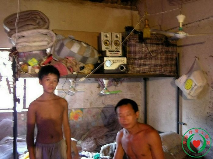 <br><br><br> 第二家,是078号,竺孟辉。这是个可爱的孩子,高高大大,一脸憨样,生活的变故并没有让他变得敏感内向纤弱。据碎心玻璃介绍,竺家原来生活条件不错,但自从三年前竺爸爸得了脑垂体瘤后,沉重的医疗费负担加上重体力劳动能力的丧失,使家庭经济状况急转直下。<br> 竺孟辉家四口人,除了父母还有个姐姐在奉化一中读高中,据说成绩很好,在班里大概前十名左右。竺家目前主要由竺妈妈打零工每月赚一千多块钱维持家里的开销。除了平常的吃穿用,每月给竺爸爸复诊配药,姐弟俩的学习用度,使这个家常常入不敷出。<br><br> 憨厚的竺孟辉和他的爸爸。<br>