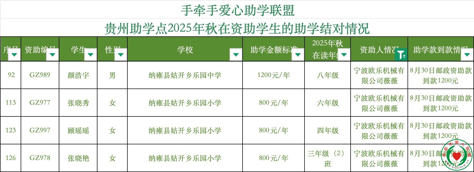 | 97 | GZ999 | 谢建国 | 男 | 纳雍县乐园中学 | 1200元/年 | 八年级 | 陈祎(安娜朋友) | 8月28日支付宝资助款到款1200元 |