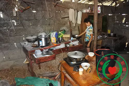 王洪军家简陋的厨房。相比一年前,王洪军的性格更内向了,不愿说话,因他奶奶去茨竹某农家乐临时帮工了,王洪军一个人吃完饭,默默地在厨房收拾。