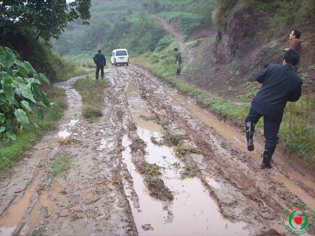 在泥泞的公路上,需穿着雨靴艰难前行