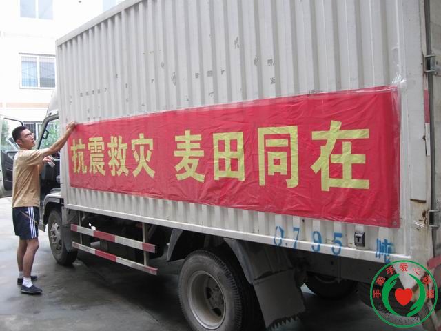 把标语和横幅挂上,准备出发。(麦田的标语很是醒目)