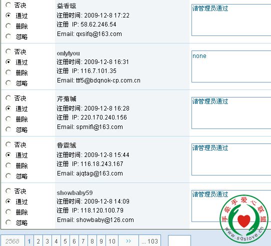 <P>发现后台有103页的用户没人审核过,也不知道论坛什么时候,哪位网管进行了审核设置,后台有很多用户一直没人审核,堆积在那</P>