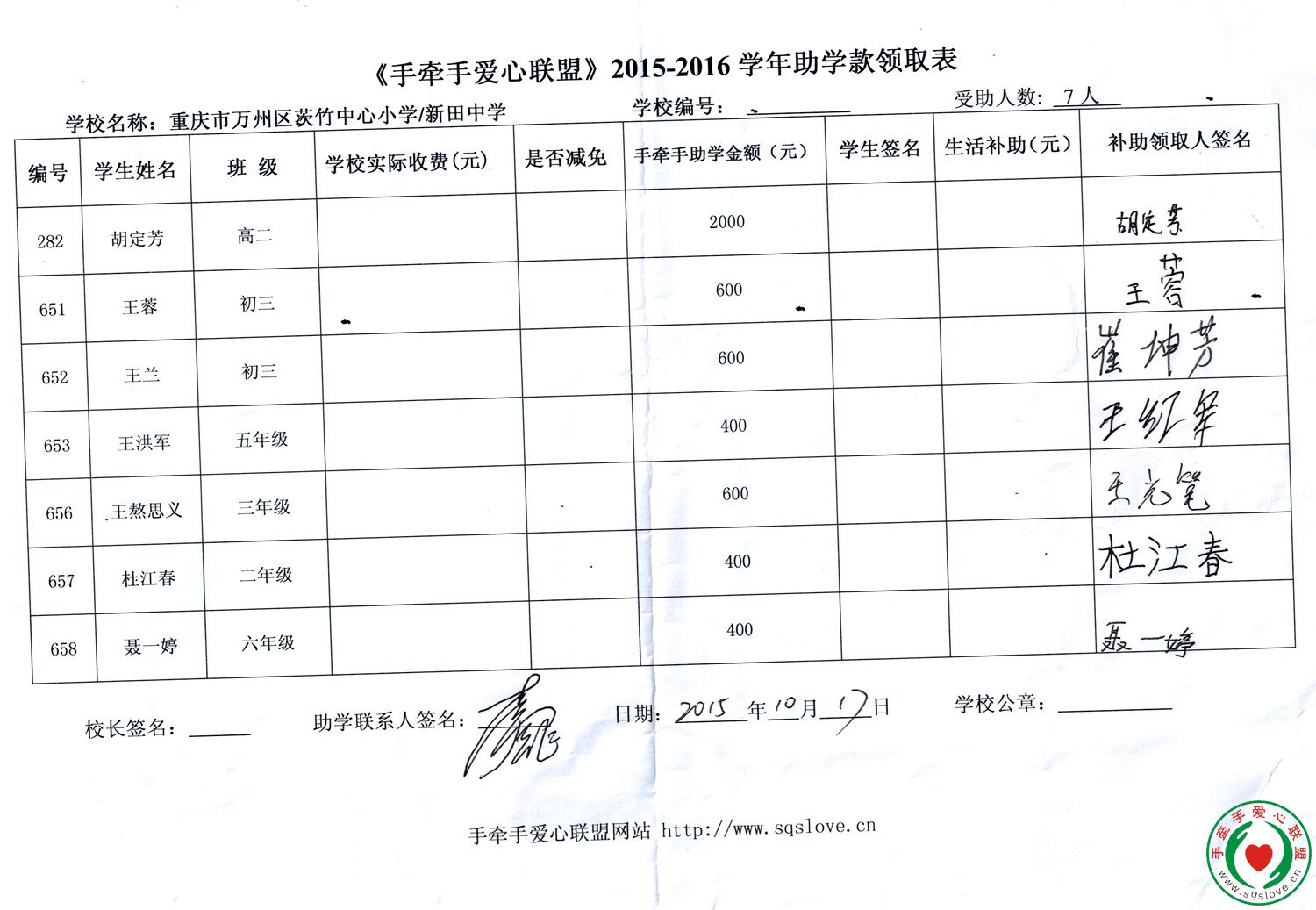 2015年10月17日,手牵手重庆志愿者李云飞、李松在万州区茨竹乡集中发放2015-2016学年助学款,共向7名结对学生发放助学款5000元。在此感谢手牵手爱心联盟及资助者对茨竹乡学子的厚爱及帮助。