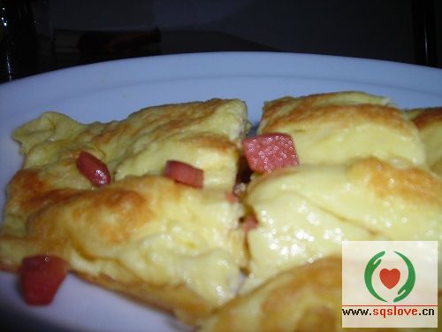 5.将油烧8分热,把打好的面粉鸡蛋在锅里煎,而后放上火腿,因为我油放的太多,煎的鸡蛋饼,有点软,但是味道不错