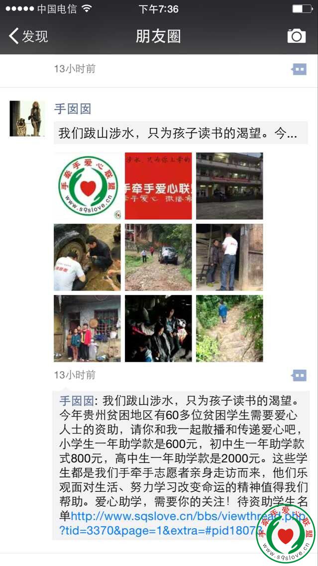 2015年6月22日夜,我在论坛上和微信上发布了贵州贫困学生待资助的资料。没想到第二天早上6点就有朋友告诉我确定资助三个学生,中午、下午不断收到想要资助学生的爱心人士的电话和QQ、微信联系,在手牵手志愿者伙伴的一起努力下,我们第一天成功确定资助了25个学生。每一位资助人主动和我们的联系,都让我们很感动,很感激,看着这些孩子们信息后不断地被备注“已资助”时,那份激动可以让人眼睛湿润,是感动,更是骄傲,因为我们身边有这么多有爱心的人!