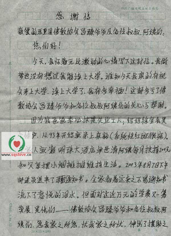 为了凸现整个事件的完全真实性,下面直接放上小女孩给87岁老和尚的感谢信之扫描图片(点击可以放大