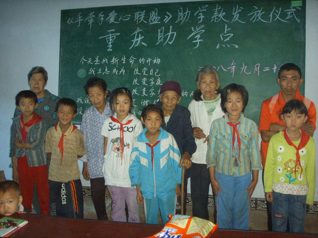 一年级的孩子(前排左边4位)、六年级二班的孩子(前排右一)和家长