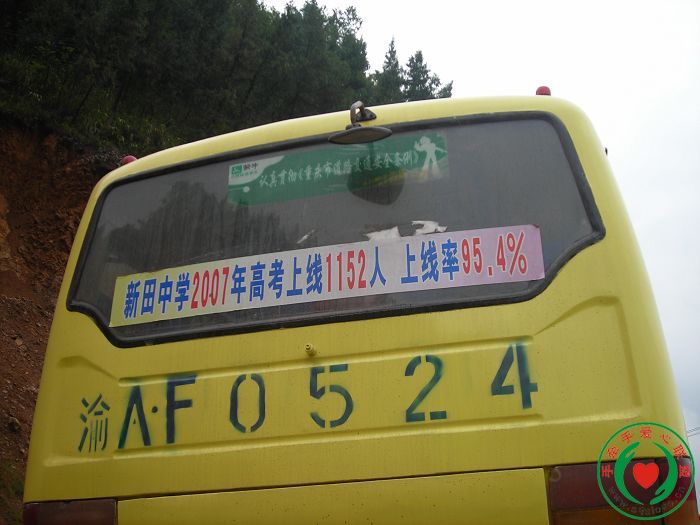 <P class=MsoNormal style="MARGIN: 0cm 0cm 0pt"><FONT color=#000000><SPAN style="FONT-FAMILY: 宋体; mso-ascii-font-family: 'Times New Roman'; mso-hansi-font-family: 'Times New Roman'">因为下雨的原因,山路多半泥石有滑崩的现象,半路上一辆中巴车因为没油了,而将我们档在了路上,还好只要没多少时间就可以上路了,在这辆中巴车上,见了新田中学的这一标题,因为新田中学也有我们资助的贫困孩子</SPAN></FONT></P>