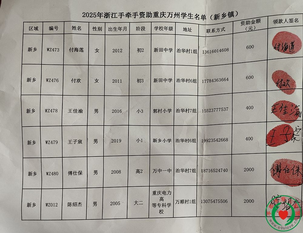 2025年8月,重庆市万州区新乡镇前方志愿者徐梅,向新乡镇的9名结对孩子逐一发放了助学款,其中小学